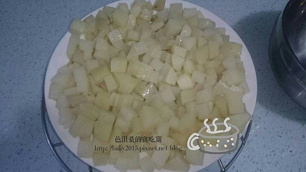 - 馬鈴薯洗淨,去皮切丁,放入電鍋蒸熟。