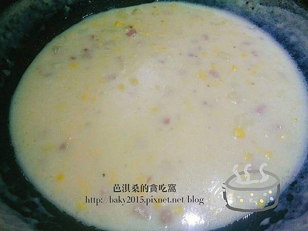 - 放入鍋中煮沸,然後加入剩餘的材料(馬鈴薯,火腿,玉米)煮滾。