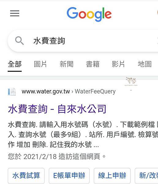 首先在google大神裡面輸入[水費查詢]關鍵字,然後就會出現以下的結果,點選[水費查詢-自來水公司]這項,也可以直接點選我提供的連結啦。