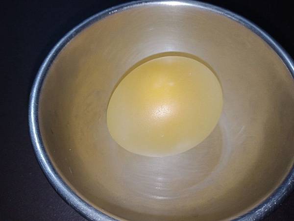 這個實驗是我們家甜甜圈哥哥在康軒雜誌上所看到的,是利用白醋浸泡蛋殼,然後將蛋殼鈣化溶解,剩下就是光溜溜的殼膜包著蛋白與蛋黃,大概是因為看起來實在太像ㄉㄨㄞㄉㄨㄞ的彈力球了,所以對於小朋友很有吸引力。